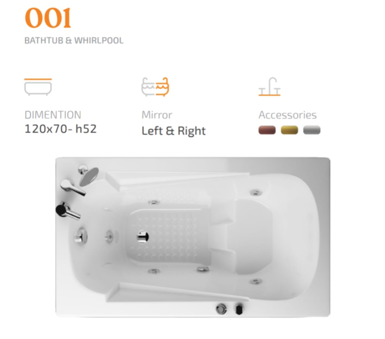 این وان به صورت پایه و ساده عرضه میشود، اما امکان افزودن پنل جلو، شیرآلات مختلف (کروم، سفید کروم، طلایی و غیره) و سیستم تخلیه اتوماتیک (سیفون اتوماتیک) فراهم است.