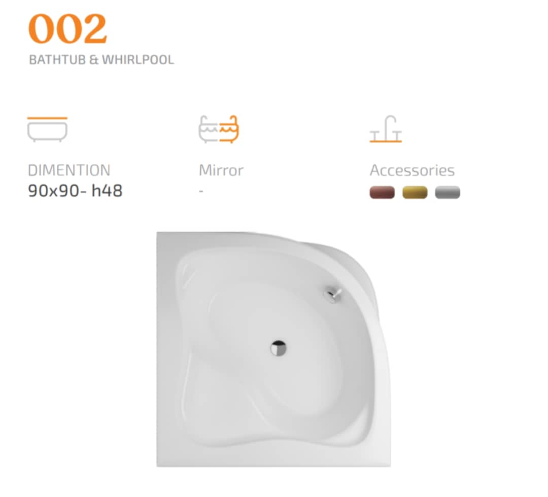وان جکوزی باداب مدل 002 یک وان جمع‌وجور و تک‌نفره است که با ابعاد ۹۰×۹۰×۴۸ سانتی‌متر طراحی شده و برای حمام‌های کوچک بسیار مناسب می‌باشد.